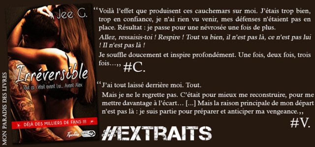 Pari réussi haut la main pour Jee G. « Irréversible » porte le titre parfait. Je ne m’attendais pas du tout à être à ce point ébranlée par cette histoire où Suspens, Horreur, Vengeance, Passions et Érotisme sont au rendez-vous. L’auteure a su faire preuve d’ingéniosité. Alors tout ce que j’ai à lui dire c’est BRAVO Miss Jee G.