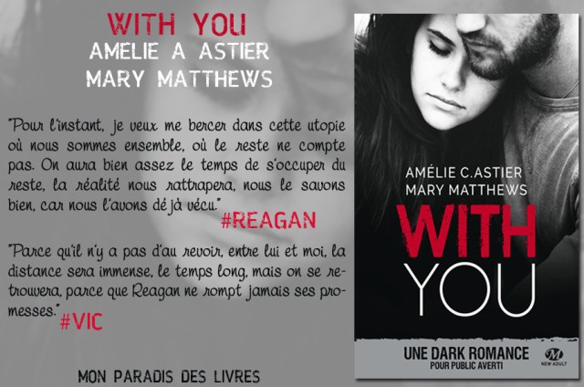 De tous les écrits que j’ai connu de ce duo hors pair, pour ma part « With you » est leur plus belle réussite. C’est bien plus qu’une simple Dark Romance. C’est un petit chef d’œuvre à la fois vibrant et terrifiant qui m’a tenue prisonnière jusqu’à la fin. Alors petit conseil à vous chers lecteurs : Accrochez car vous allez vivre une expérience inédite que vous ne serez pas prêt d’oublier pas de sitôt.