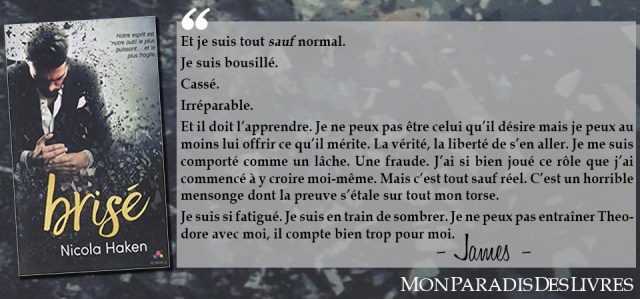 Une première rencontre explosive qui va marquer l’un comme l’autre. Une relation des plus complexes avec beaucoup de douleur et de secrets. Chaque jour est une lutte. Et pourtant, un lien spécial se tisse et prend de plus en plus d’ampleur. Mais contre toute attente, les sombres démons de James refont surfassent. Il va perdre pied et il ne voudra plus se battre. Theo n’a d’autre choix que de mener ce combat seul s’il veut que leur couple ait une chance…