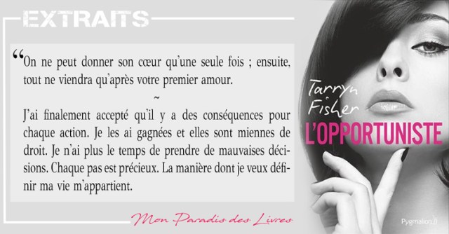 Un début plus que réussis pour moi. Je ne m’attendais pas à être à ce point impliquer dans l’histoire. Mais le pire c’est cette fin que je n’ai pas vu venir. Je ne m’étais pas préparée à cela. Je vous rassure de suite ce n’est pas un cliffhanger. Malgré tout je veux la suite… Il me faut en avoir le cœur net. « L’Opportuniste » porte le titre adéquat. Je n’ai jamais rien lu de tel. Si vous cherchez un livre qui sort de l’ordinaire et qui vous fasse vibrer au plus haut point, ce livre est fait pour vous. Quand à moi, il me tarde de lire la suite à venir…