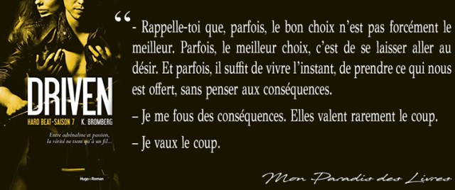 Un sans faute pour « Hard beeat ». C’est le parfait mélange d’Humour, de Joutes Verbales, d’Actions, de Suspens, de Tension Palpable, de Secrets, de Blessures, d’Émotions fortes, de Passion et de l’Érotisme. Tout ce qu’il faut pour passer un excellent inoubliable moment. Pour ma part, c’est le meilleur des tomes. Je tiens à déclarer que non seulement K. Bromberg est un génie mais elle est également le diable personnifié. Put*** oui… je le reconnais elle m’a eu en beauté. Wow.. jusqu’à la fin elle m’aura fait douté. J’étais tellement déboussolée et perturbée par la tournure des évènements que je ne savais plus quoi en penser. Je m’étais préparée à tout sauf à ça. Alors je finirai en disant : Bravo à vous Mme Bromberg, vous avez réussis votre coup !