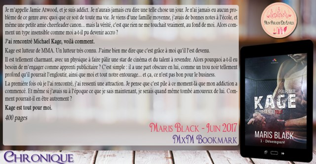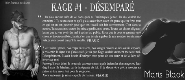 Un premier opus à couper le souffle… Bien que certains aspects restent en suspens (vivement la suite), je ne m’attendais pas à kiffer ma lecture et à vibrer à ce point. On est tellement impliqué dans l’histoire que l’on ne voit pas arriver cette fin qui vous laissera sous le choc et très fébrile. Croyez-moi vous n’allez pas en revenir et vous allez hurler de rage… j’ai bien faillit balancer ma liseuse contre le mur… KAGE est une série qui commence très, très fort… La preuve, je suis déjà une grande FAN… Et je suis plus qu’impatiente de lire la suite à venir car je suis persuadée que Maris Black nous réserve encore quelques surprises… Pour moi ça sera très prochainement et en VO…