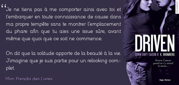 Je dis et le redis haut et fort et je ne m’en lasse pas : K. Bromberg est un Vrai Génie. Elle clôture comme il se doit cette phénoménale saga tout en nous laissant un très beau message. Il faut laisser le passé derrière soit si on ne veut pas que cela affecte notre futur. Certes ce n’est pas une chose aisée mais il suffit de laisser une personne entrée dans notre vie et la laisser devenir notre eau pour aller de l’avant… Driven est et restera l’une de mes sagas préférées.