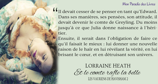 Mais ce qui me plaît le plus chez Lorraine Heath c’est que non seulement elle arrive toujours à créer des personnages épatants mais en plus elle arrive en mettre en avant une dure réalité. La place et le rôle de la femme dans cette société Victorienne. Et je dois bien l’avouer que cela ne m’a pas laissée indifférente.