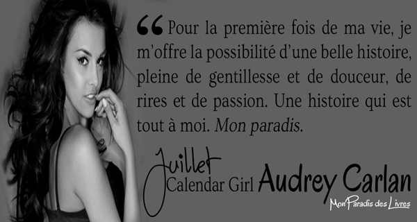 C’est de loin mon tome préféré. Une fois n’est pas coutume, Audrey Carlan a su répondre à toutes mes attentes. Comment fait-elle cela ? Je ne sais pas et je ne vais pas m’en plaindre bien au contraire. Une chose est sûre Calendar Girl est une saga unique dans son genre. Pourquoi ? Je m’attendais à tout autre chose avec ce style de mode de vie. Et au final, j’en suis devenue littéralement accro… et je peux d’ores et déjà vous dire que « Août » s’annonce très prometteur…