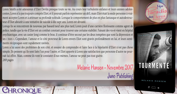 Avec une plume frappante et envoûtante, Melanie Hansen nous offre un récit hors norme. Elle aborde avec une grande justesse un autre aspect d’une maladie bien réelle qui n’a pas de finition exacte tant elle est complexe et difficile à accepter ainsi que les répercussions sur le malade mais également sur ses proches. Et avant toute chose, je tiens absolument à féliciter l’auteur pour ne pas avoir embelli les sombres détails de cette maladie mentale tout en mettant face à la laideur des répercutions que cela peut engendrer dans une relation. Certains lecteurs risquent d’être choqués et bouleversé en découvrant cette troublante et terrible vérité. Mais pour moi, si l’auteur avait fait autrement cela ne m’aurait pas paru aussi réel…