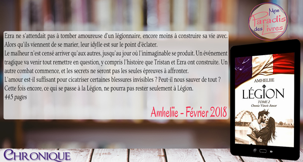 Y’a pas à dire, Amheliee manie les mots comme personne pour insuffler à ses lecteurs des émotions brutes. J’ai beau m’y préparer à l’avance mais elle arrive toujours à me faire vibrer tout en faisant monter ma tension jusqu’à son paroxysme. C’est tout simplement extraordinaire. Il faut dire que créer une romance dans cet univers si particulier et codé de la Légion étrangère n’est pas une chose aisée. Mais en nous prouvant de la meilleure façon qui soit que malgré l’horreur du monde, l’amour triomphe de tout et nous prouve que la vie est belle, Amheliie a relevé haut la main son défi.