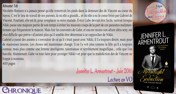 En bref… Une fois n’est pas coutume, j’ai succombé à la plume si fine et exceptionnelle de Jennifer L. Armentrout. « Moonlight Seduction » est l’une de ces enivrantes et captivantes histoires de seconde chance sur fond de suspens qui vous happent dès les premières pages et qui vous fera vibrer de la meilleure façon qui soit. Vous ne connaissez pas encore les légendaires frères de Vincent ? Laissez-vous tenter ! Vous allez vous régaler !