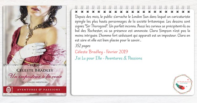 En bref… Une fois n’est pas coutume, j’ai littéralement succombé à la plume si fine de Céleste Bradley ! « Un imposteur à la cour » est une palpitante et pétillante lecture où humour, action, danger, tension, passion et émotions vives sont au rendez-vous. Tout ce qu’il faut pour passer un excellent moment. Et je n’ai qu’une savoir savoir ce que l’auteur va me réserver dans la suite à venir. Et mon petit me dit que cela va être sensationnel…