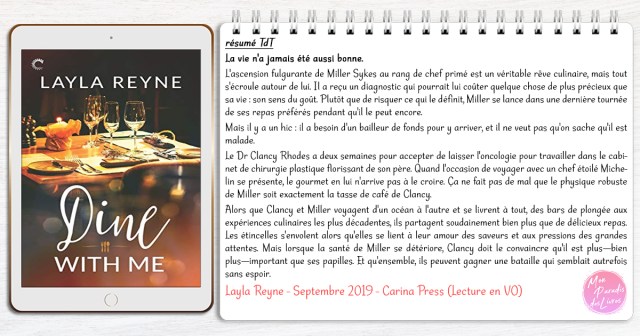 En bref… Il est vrai qu’au début de ma lecture j’ai eu quelques doutes. Faire face à une maladie grave est terrifiant. Mais très vite grâce à la plume si fine de Layla Reyne la donne a complètement changé. Avec un naturel désarmant, elle arrive à susciter chez ses lecteurs des émotions brutes allant jusqu’à vous faire pleurer à chaudes larmes. Certes « Dine with me » est très différent de ses écrits où l’action et le suspens sont au rendez-vous. Mais c’est une émouvante leçon de la vie qui ne laissera quiconque indifférent et qui nous laisse un très beau message d’espoir… À découvrir !