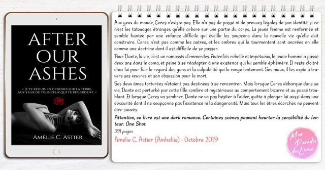 En bref… Comme vous l’aurez compris « After our ashes » est un véritable coup foudre livresque ! C’est fou quand même, j’ai beau m’y être préparée à l’avance mais Amélie arrive toujours à me prendre au dépourvu tout en me faisant faire un tour dans d’immenses montagnes russes émotionnelles ! J’ai beau me répéter mais chapeau bas à toi Amh ! Car je n’ai jamais rien lu de tel ! J’ai beaucoup souffert, j’ai été révoltée mais également horrifiée, j’ai aussi souri, j’ai été fascinée par l’histoire Ceres & Dantes et plus que tout ma nuit fut ultra courte voir carrément chaotique. Mais cela en valait largement la peine ! Ce petit diamant à l’état brut est une déchirante et époustouflante dark romance qui marque les esprits à jamais et qui est à découvrir pour les amateurs de ce genre…