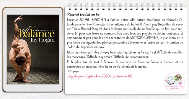 En bref… C’est mon premier livre de Jay Hogan et cela ne sera certainement pas le dernier. Il faut dire que cette fine plume a réunit tous les ingrédients nécessaires pour que je passe un excellent moment. Entre tension, suspens, mystère, rebondissements, humour, sensualité et émotions brutes, je ne me suis pas ennuyée un seul instant. « Off Balance » est une émouvante et palpitante lecture à travers un fascinant décor qui vous happera dès les premières pages pour ne plus vous lâcher, qui vous fera vibrer dans tous les sens du terme, qui vous réconfortera de la meilleure façon qui soit et qui est à savourer sans modération. Quand à moi, je n’ai qu’une hâte découvrir ce qu’elle va me réserver dans la suite à venir…