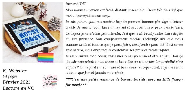 En bref… À nouveau j’ai littéralement succombé à la plume si fine de K. Webster. Même en à peine quatre-vingt dix pages et même en utilisant une intrigue des plus basique, elle arrive à nous faire passer un délicieux moment. « Bossy Mr. Frosty » est une rafraîchissante et pétillante lecture feeling good qui vous mettra du baume cœur, qui vous fera divinement vibrer et qui est à savourer sans modération…