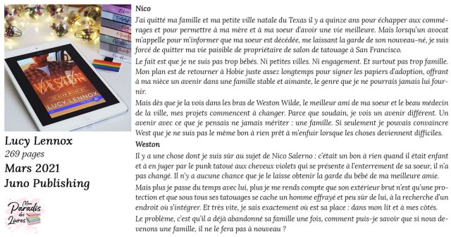 Passons maintenant à Weston. Aux premiers abords, il vous apparaîtra un brut sur les bords et il va légèrement vous agacer pour son jugement trop hâtif. Mais fort heureusement, il sait reconnaître quand il se plante et il saura vite se reprendre pour faire ce qu’il faut pour se faire pardonner. Et comme moi, vous finirez par succomber à ce cowboy sexy et ultra protecteur envers ceux qu’il aime. Mais ce qu’il n’avait pas vu venir c’est l’arrivée de ce mec qui le rend complètement dingue et qui éveille en lui des sentiments contradictoires…