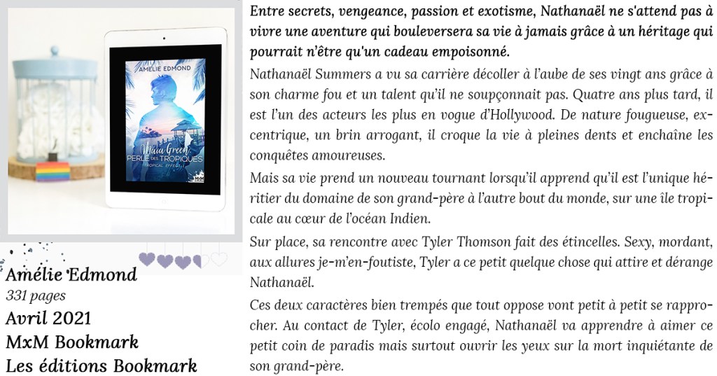 En bref… Il est vrai que je m’attendais à un tout autre genre de lecture. Et pourtant il m’est impossible de dire que je ressors de ma lecture déçue. Pourquoi ? Et bien une fois plongée dans ce magnifique décor paradisiaque, à aucun moment (et j’insiste bien là-dessus) j’ai eu envie de m’arrêter. C’est même toute le contraire. Entre une intrigue habilement menée, des personnages piquants à souhait, rebondissements, action, tension palpable, humour, mystère, passion et émotions bien présentes, je me suis littéralement régalée. Et je n’ai qu’une hâte savoir ce qu’Amélie Edmond va me réserver dans la suite à venir…