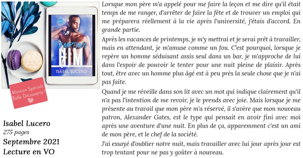 En bref… Un MM comme je les aime tant. Une intrigue menée avec une grande finesse. Des sujets sensibles de notre société tels que la violence psychologique ou l’homophobie abordés avec un naturel désarmant. Des personnages sublimement étoffés. Et des émotions brutes bien présentes. Tout ce qu’il faut pour passer un excellentissime moment. Vous cherchez une lecture qui vous happe dès les premières pages pour ne plus vous lâcher, qui vous fasse vibrer à tous les niveaux et qui laisse un message fort. Alors « Tempting Him » est exactement ce qu’il vous faut. C’était mon premier roman d’Isabel Lucero et cela ne sera pas mon dernier…