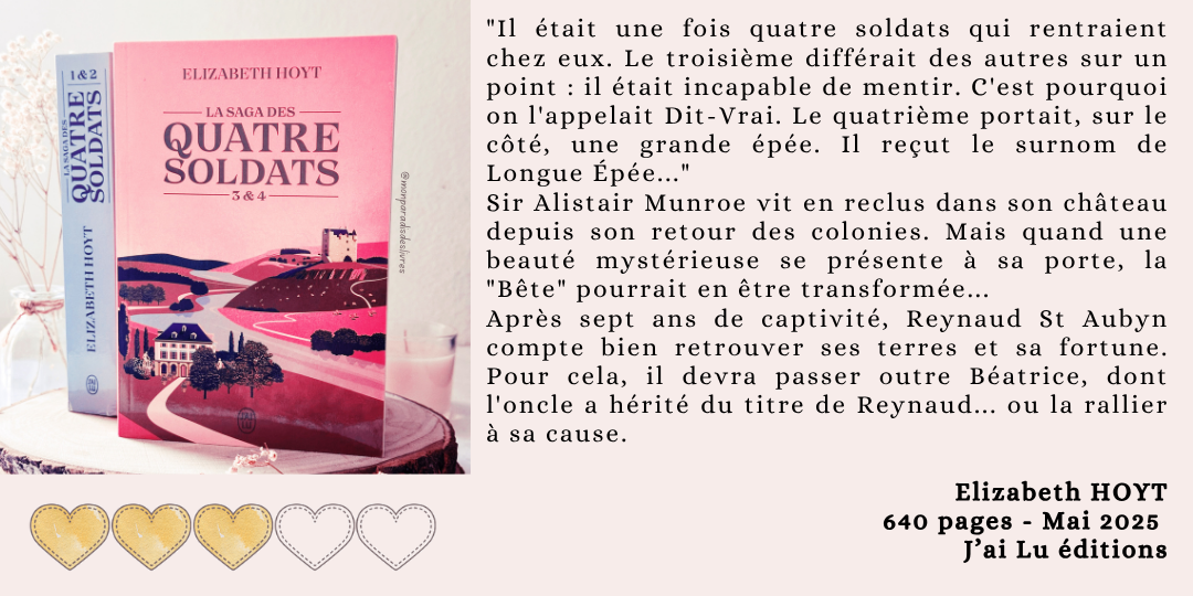 En bref… Une deuxième intégrale en demi-teinte. Si je me suis bien amusée dans le troisième opus, pour le dernier ce ne fut malheureusement pas totalement le cas. C’est même celui que j’ai le moins aimé de la saga. Ce qui est fort dommage. Car c’est le fameux tome qui est censé se terminer en apothéose. Néanmoins, même s’il est vrai que j’ai été quelque peu perplexe à certains moments et que j’aurais voulu que certaines choses évoluent autrement, j’ai malgré tout apprécié suivre ces sombres soldats dans leur quête de vérité. Si vous êtes amateurs de romances historiques, de héros tourmentés qui ont soif de revanche, d’héroïnes aux allures fragiles mais courageuses, d’intrigues complexes riches en émotions, d’aventures et de passions. Alors cette saga des Quatre Soldats est exactement ce qu’il vous faut.