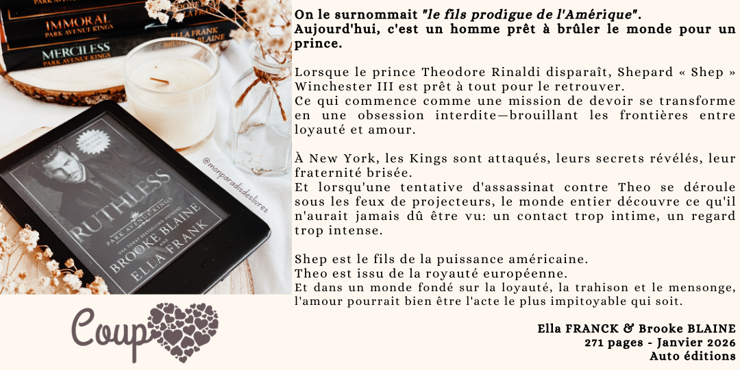 En bref… Chapeau bas à Ella Frank & Brooke Blaine pour ce petit bijou ! Une intrigue certes qui s’éloigne un peu de la réalité mais qui est remarquablement bien construit. Des anti-héros toujours aussi démentiels qui ont évolué dans le bon sens. Un rythme haletant. Des twists complètement fous. Une tension qui est à son paroxysme. Et une fin à vous faire hurler de joie. Alors si vous cherchez une palpitante romance qui vous happe dès les premières pages, vous tienne en haleine voir carrément à vif tout au long des pages et qui emballera votre cœur à la fin. Alors ce page turner par excellence est exactement ce qu’il vous faut ! Quand à moi ? Sachant sur qui sera axé le dernier opus, je suis plus que curieuse de savoir ce que Ella & Brooke vont me réserver. La seule chose dont je sois sûre que ce que cela sera authentique et d’enfer !