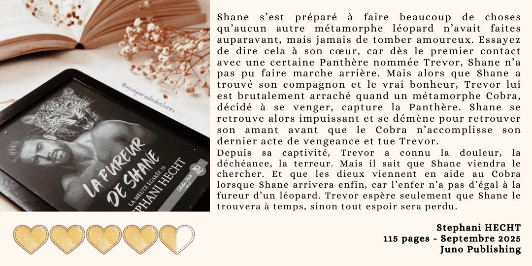 J’aurais dû être horrifiée par sa façon d’agir. Et pourtant ce fut tout le contraire. Car voyez-vous notre féroce léopard va, sous cette couche épaisse de froideur et de cruauté, dévoiler un tout autre Shane. Un léopard avec un coeur, juste enfoui sous dix tonnes de fureur et de folie. Mais pas que ça ! Un autre aspect de lui qu’il n’avait jamais montré à personne auparavant. Sauf à une seule personne. Son compagnon…