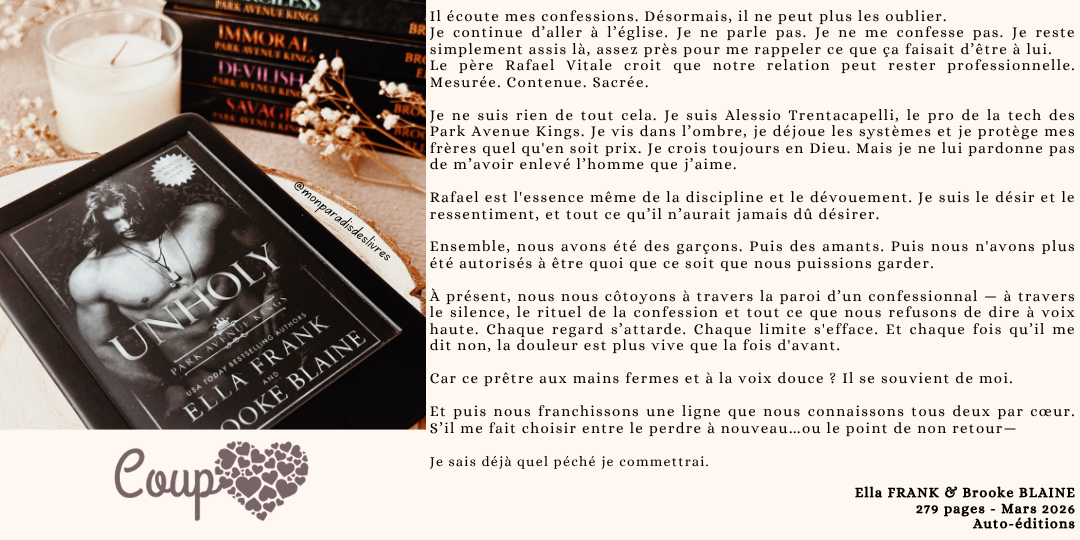En bref… Un énorme MERCI à Ella Frank & Brooke Blaine pour cet époustouflant final ! S’il est vrai qu’elles ont pris un certain risque pour l’histoire d’Alession & Rafael, on peut dire qu’elles ont relevé le défi avec brio ! Voyez-vous ce septième opus est différent des autres à bien des égards. Bien que nous soyons toujours dans l’univers fort atypique des Kings, au lieu d’avoir un scénario extravagant riche en action et en suspens, Ella & Brooke ont décidé de nous offrir une pure romance de seconde chance avec deux hommes remarquables. Un récit d’une beauté brute qui non seulement vous happera dès les premières pages, mais qui en plus vous ébranlera à tous les niveaux. Une romance interdite unique dans son genre qui marquera vos esprits et qui laissera une empreinte indélébile dans votre coeur. Un petit bijou qui aura une place de choix dans ma bibliothèque papier et qui est à découvrir…