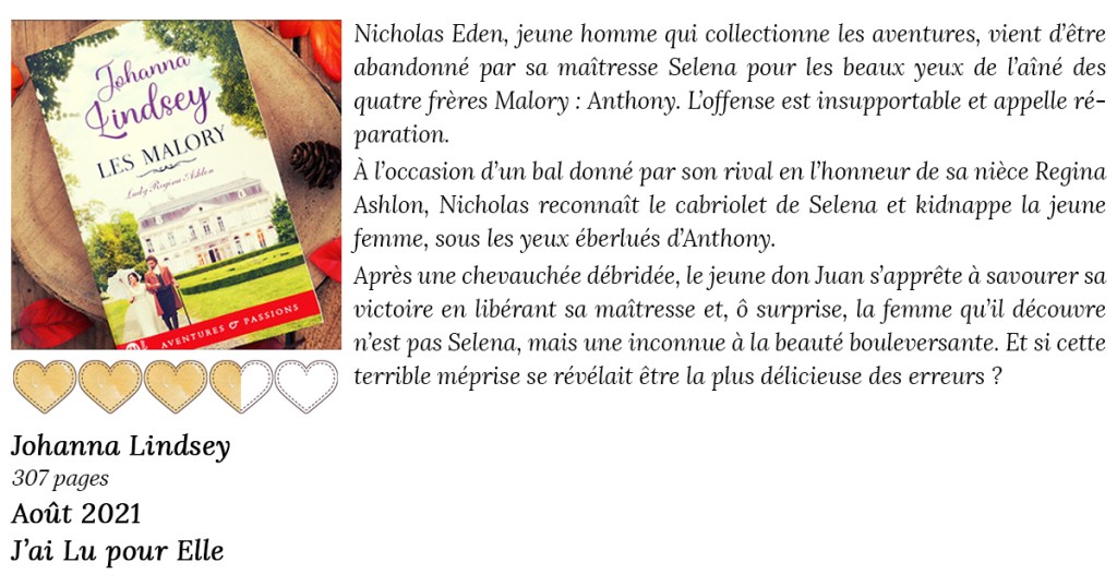 Retour avec l’une de mes sagas historiques préférées. Les frères Malory. J’ai beau avoir lu et relu chacun des tomes maintes et maintes fois, je ne m’en lasse toujours pas ! À chaque fois, j’en ressors avec un immense sourire aux lèvres. Et ce quatrième opus ne fait pas exception à la règle. Lire la suite