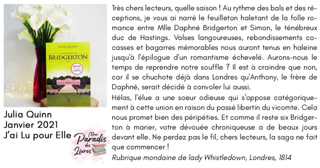 Une saga que j’ai lu et adoré il y huit ans de cela. Alors quand j’ai appris son adaptation en série TV, je n’ai pas attendu bien longtemps pour me plonger à nouveau dans les aventures de la fratrie Birdgerton. Et vous savez quoi ? Une fois de plus je ressors de ma lecture littéralement conquise… Lire la suite