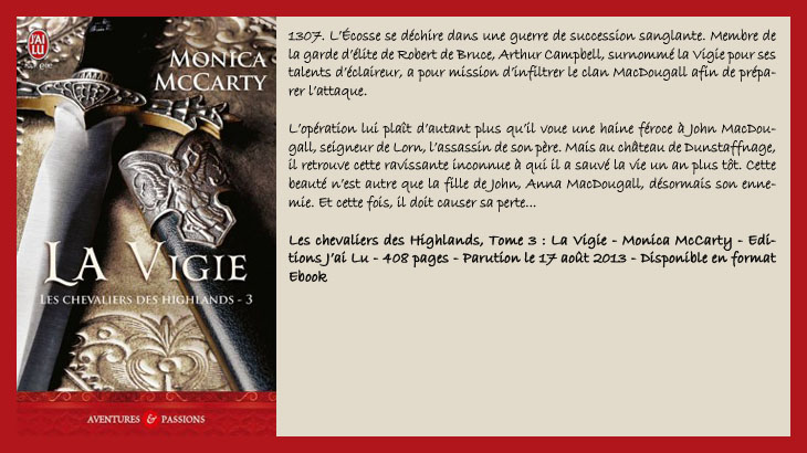 Troisième opus de la série « Les chevaliers des Highlands » de Monica McCarty, dont l’histoire est centrée sur Arthur Campbell, dit « la Vigie » l’un des membres de la garde secrète de Robert de Bruce. Il a pour mission de s’infiltrer sur le clan des MacDougall, ennemi allié aux Anglais et fidèle au roi Edouard II, dont le chef n’est autre que John Lorn, le meurtrier de son père Colin Campbell. Arthur a juré de faire justice à son père en anéantissant John Lorn pour sa traîtrise quatorze ans plus tôt. Mais ce à quoi il ne s’attendait pas c’est de retrouver la jeune fille dont il a sauvé la vie un an plutôt. Anna MacDougall n’est autre que la fille de Lorn. Mais les choses se compliquent car Arthur et Anna se rapprochent et ne peuvent plus nier leur attirance mutuelle. Qui va triompher la justice et la loyauté ou l’amour ? Lire la suite